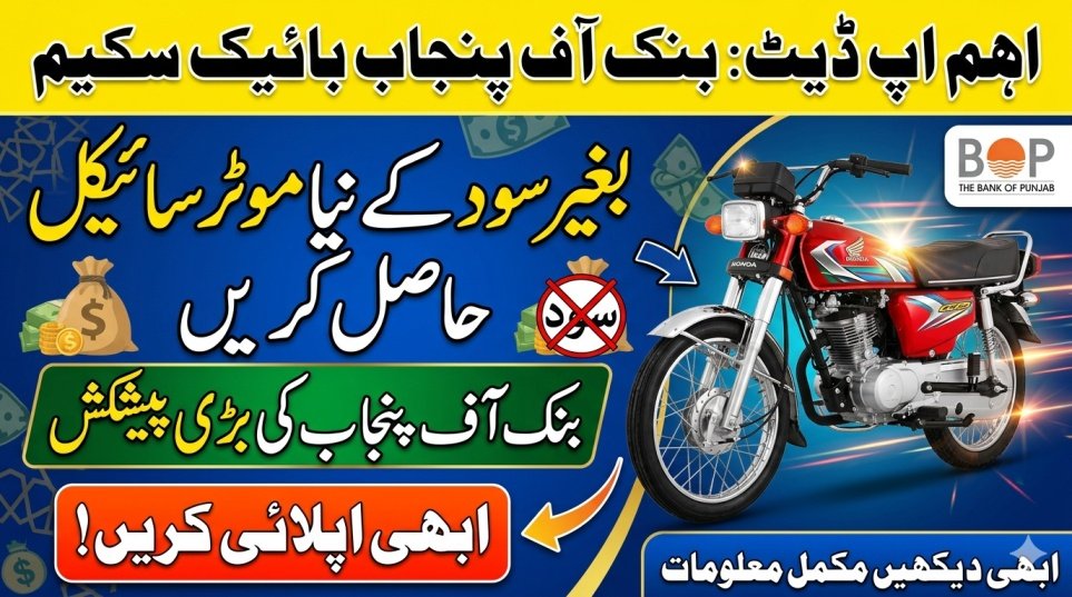 The Bank of Punjab motorcycle financing scheme allows people to buy motorcycles through easy monthly payments. This program is designed to reduce financial pressure and provide affordable transport to the public.