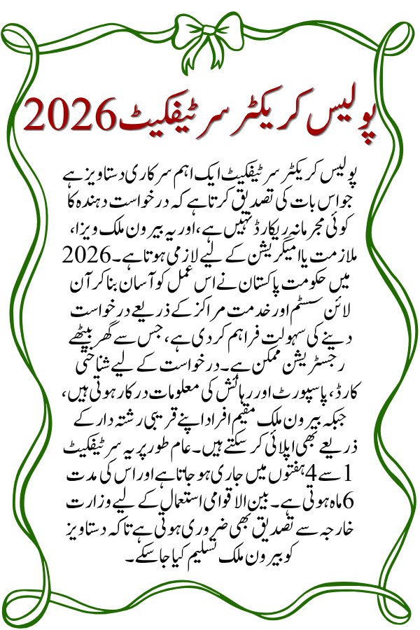 The Police Character Certificate Pakistan is an official document issued by the District Police Officer or Khidmat Centers that verifies a person’s criminal record. In 2026, it includes a QR code for quick verification, making it acceptable internationally. Its purpose is to confirm that the applicant has not been involved in any criminal activities. It is required for visas and is also increasingly used by companies for background checks.